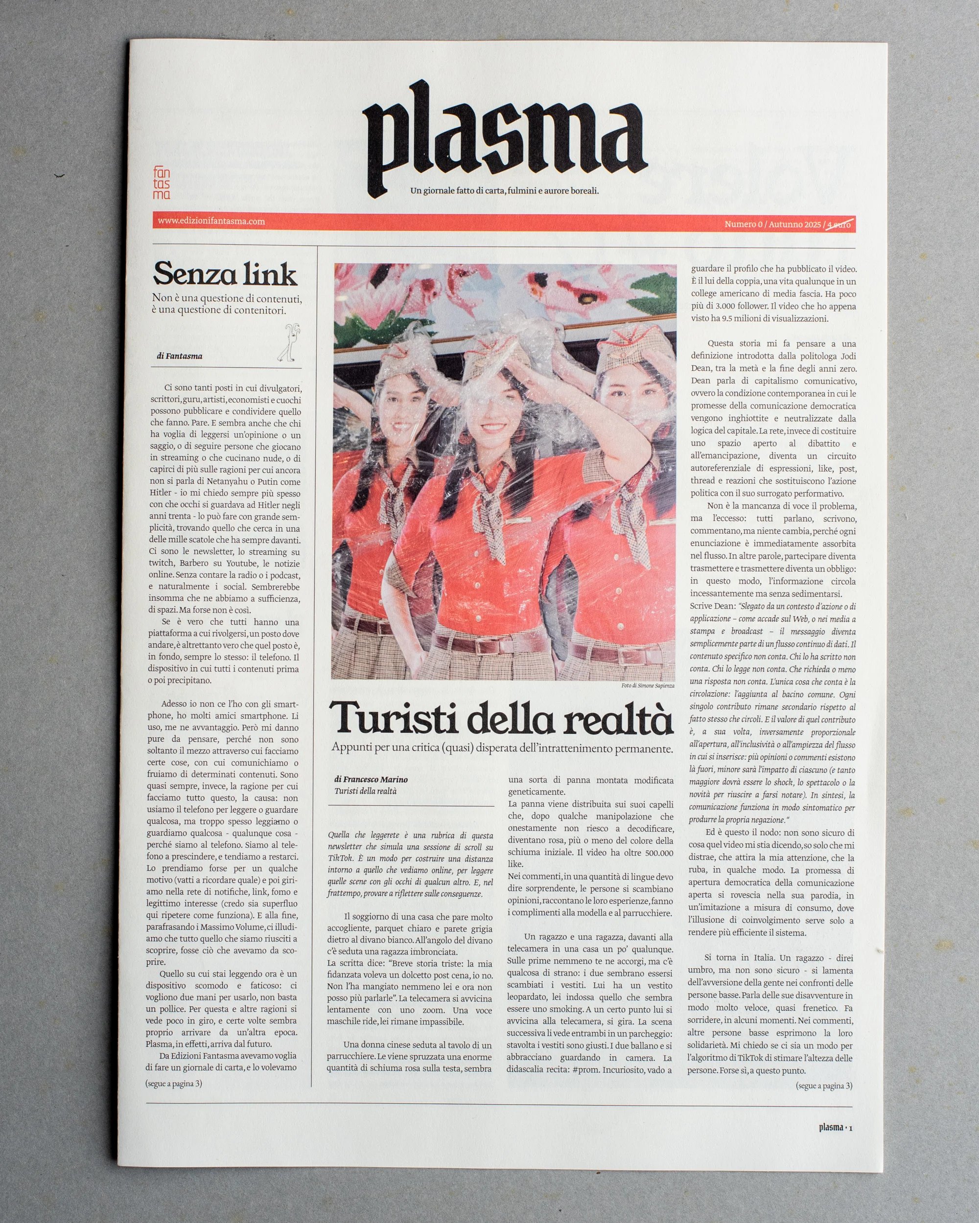 Plasma è un giornale fatto di carta, fulmini e aurore boreali. Propone a cadenza stagionale una selezione di contenuti pensati e pubblicati generalmente sul web e sulle piattaforme, cercando di vedere l’effetto che fa.